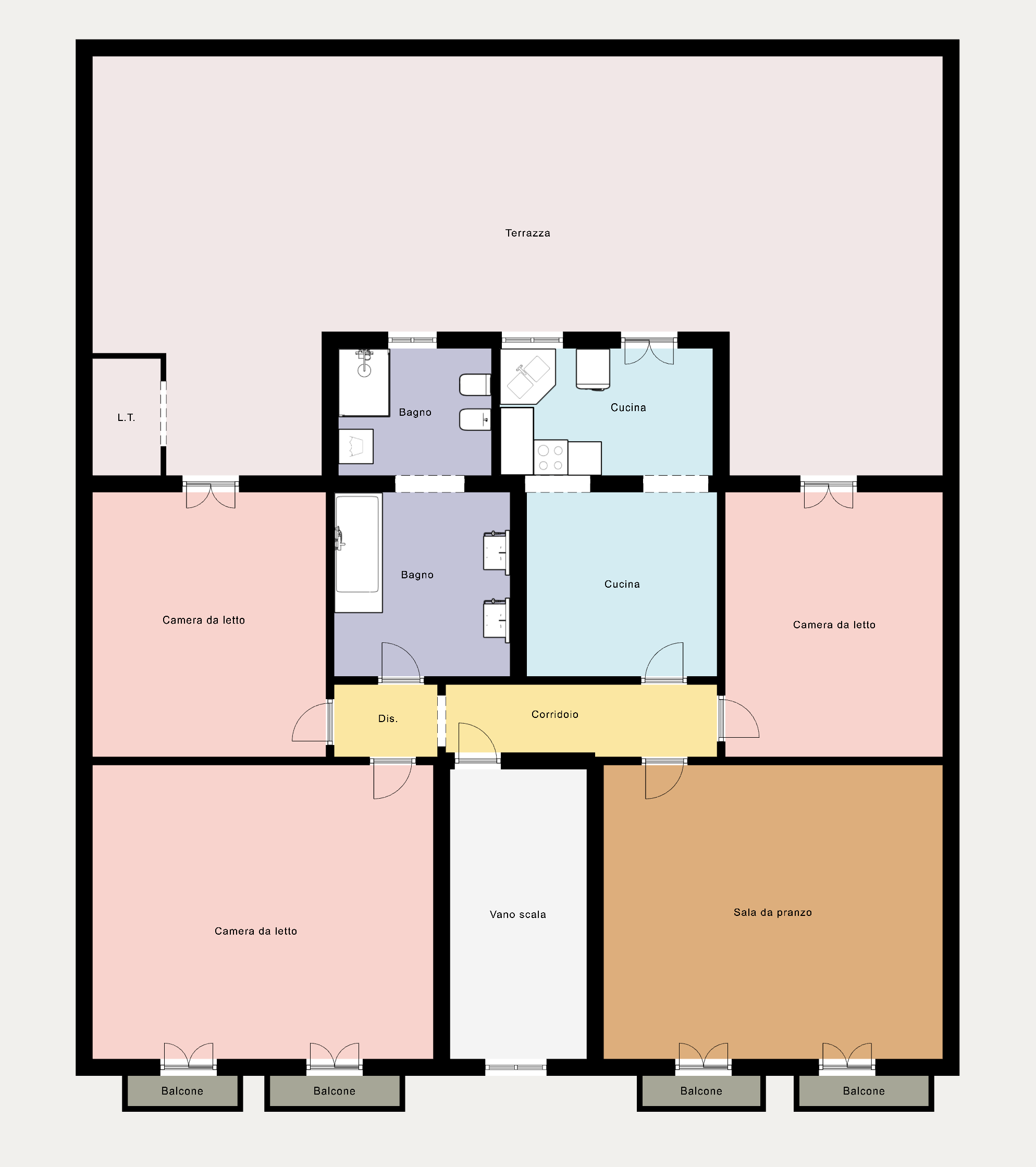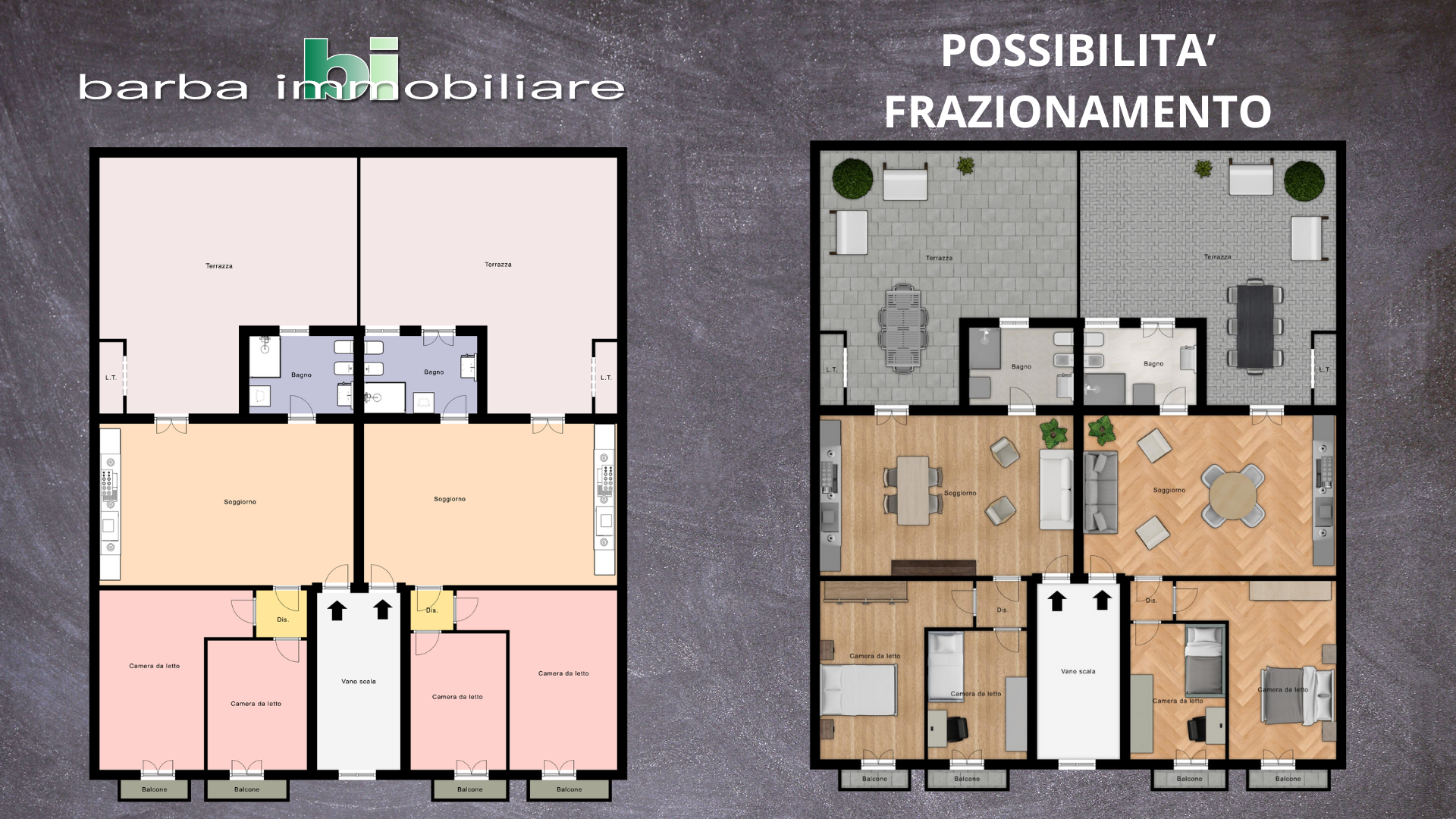 Considerata l’ampia metratura e la posizione centrale della scala è possibile ricavare più unità immobiliari senza dover intervenire con drastici interventi strutturali, realizzando due unità trilocali di circa 70 mq con oltre 40 mq di terrazzo panoramico ciascuna. Per il suggerimento si veda planimetria allegata.